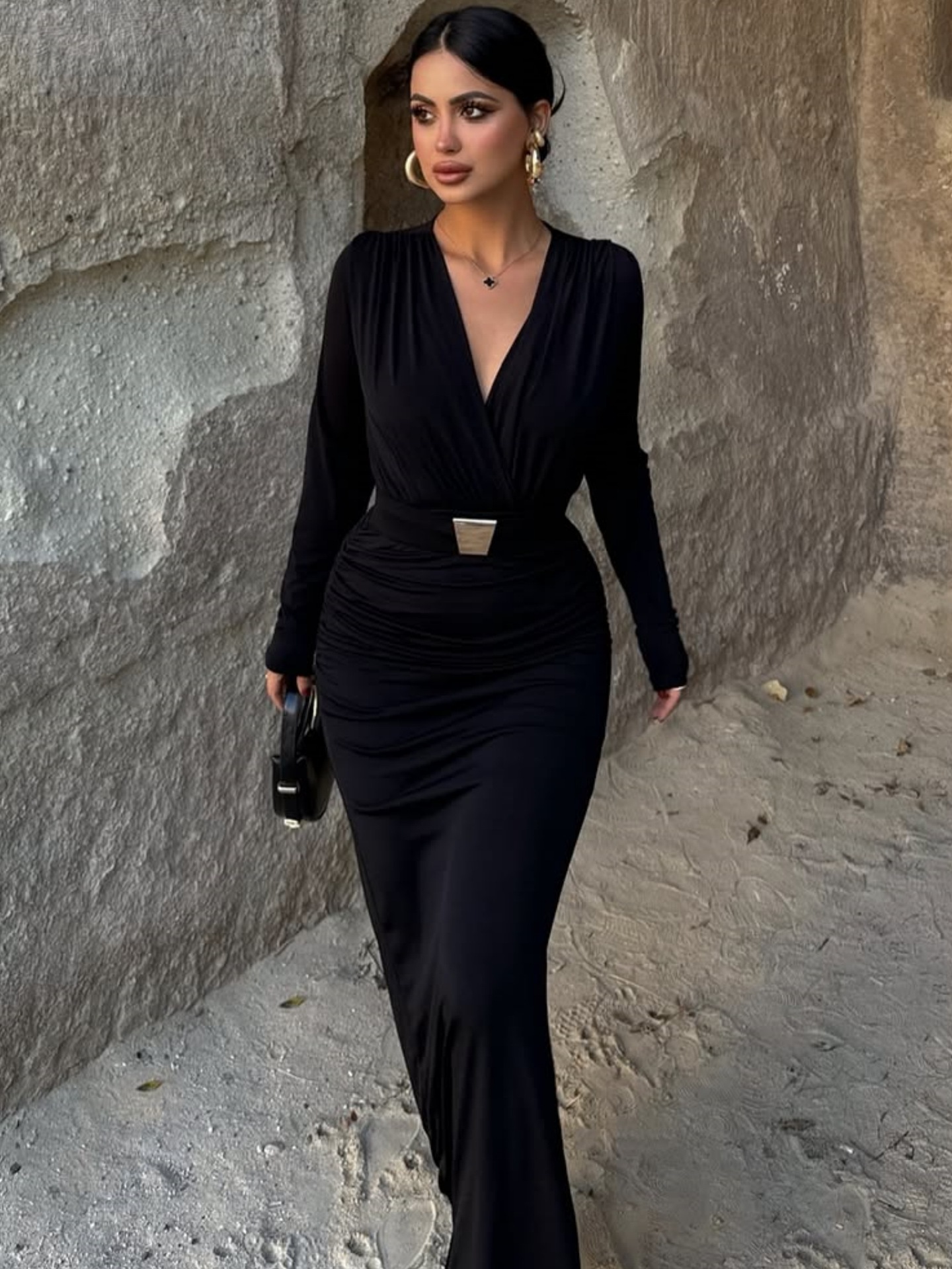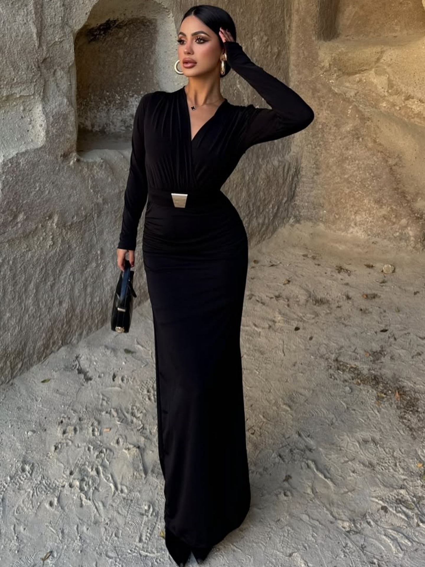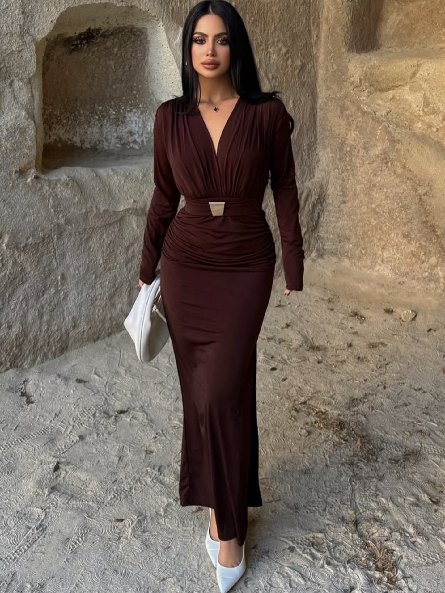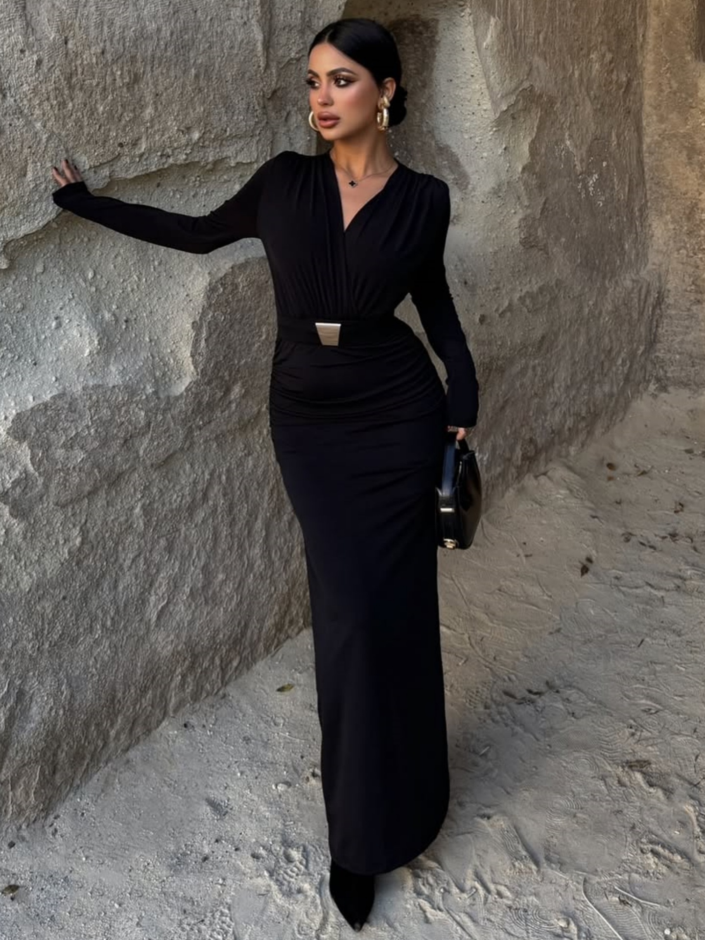 Elegant Embellished Belt Deep-V Long-sleeve Autumn Dress
