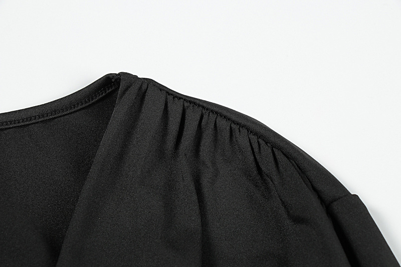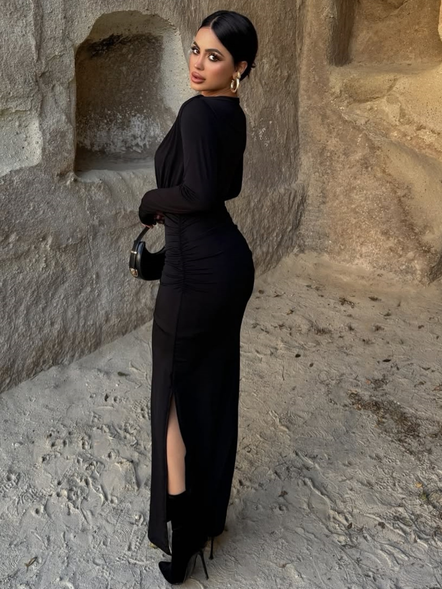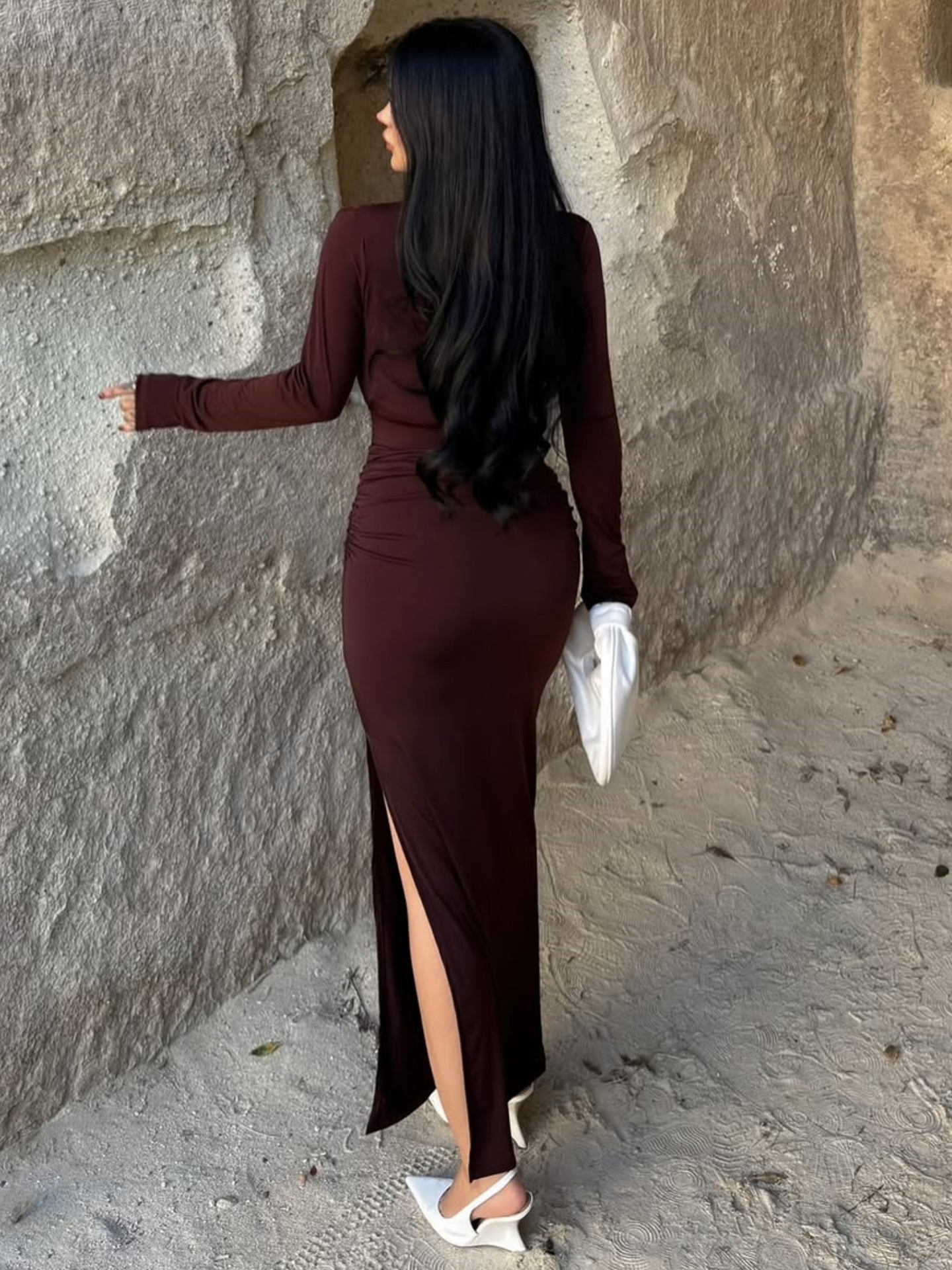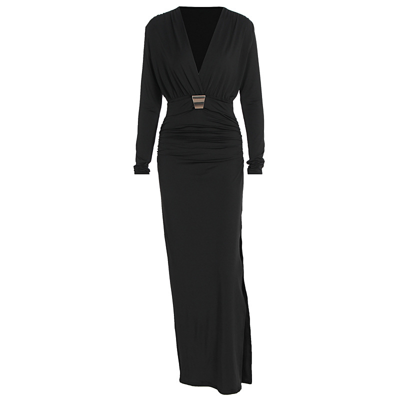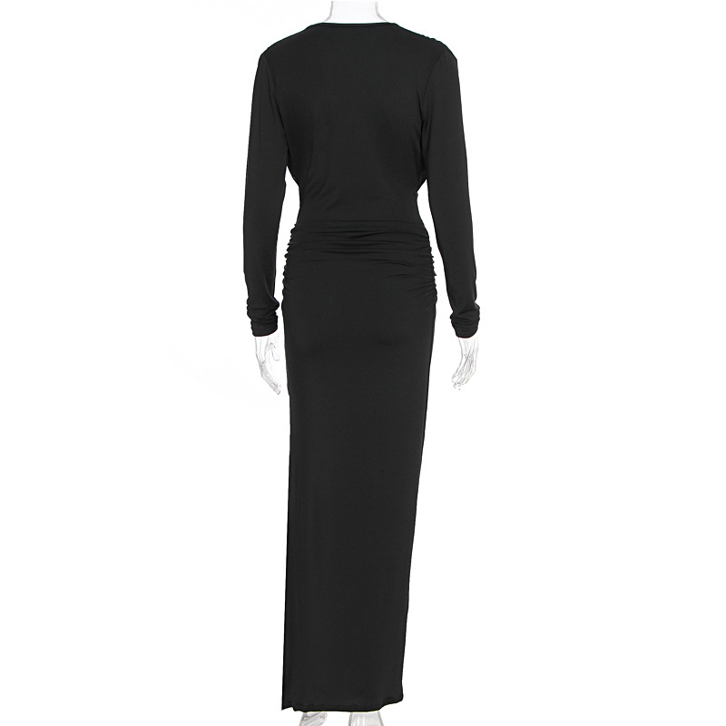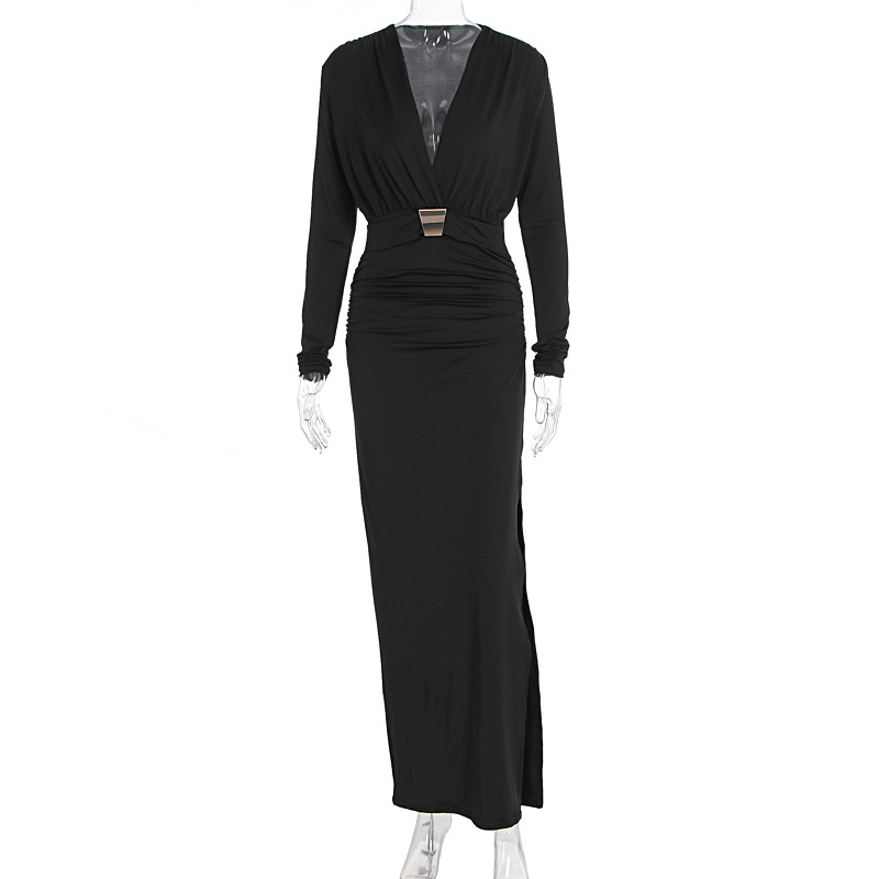 Elegant Embellished Belt Deep-V Long-sleeve Autumn Dress