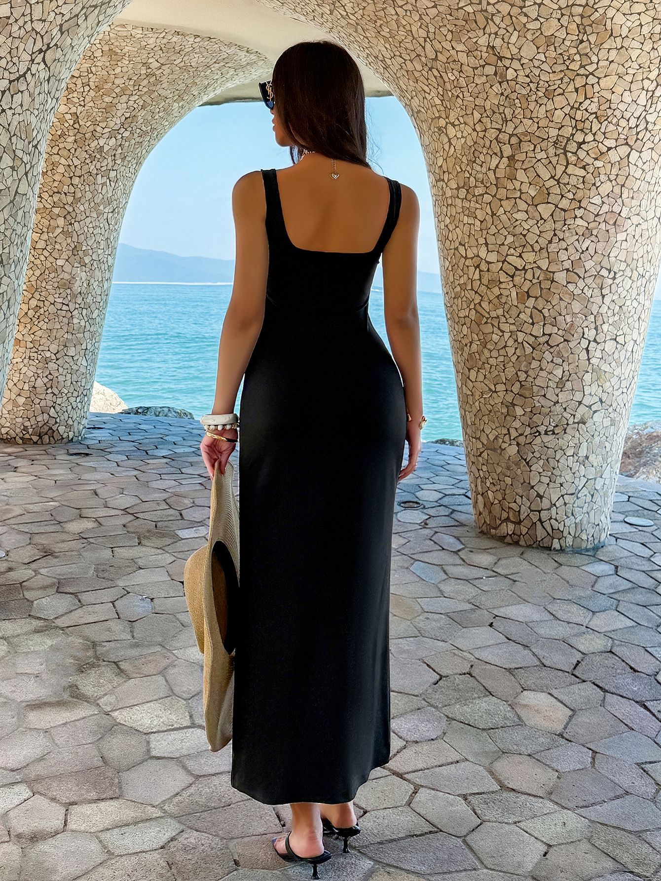 Elegant Square-neck Solid-color Slim-fit Dress For Women