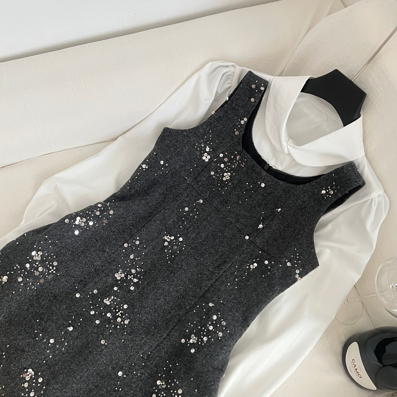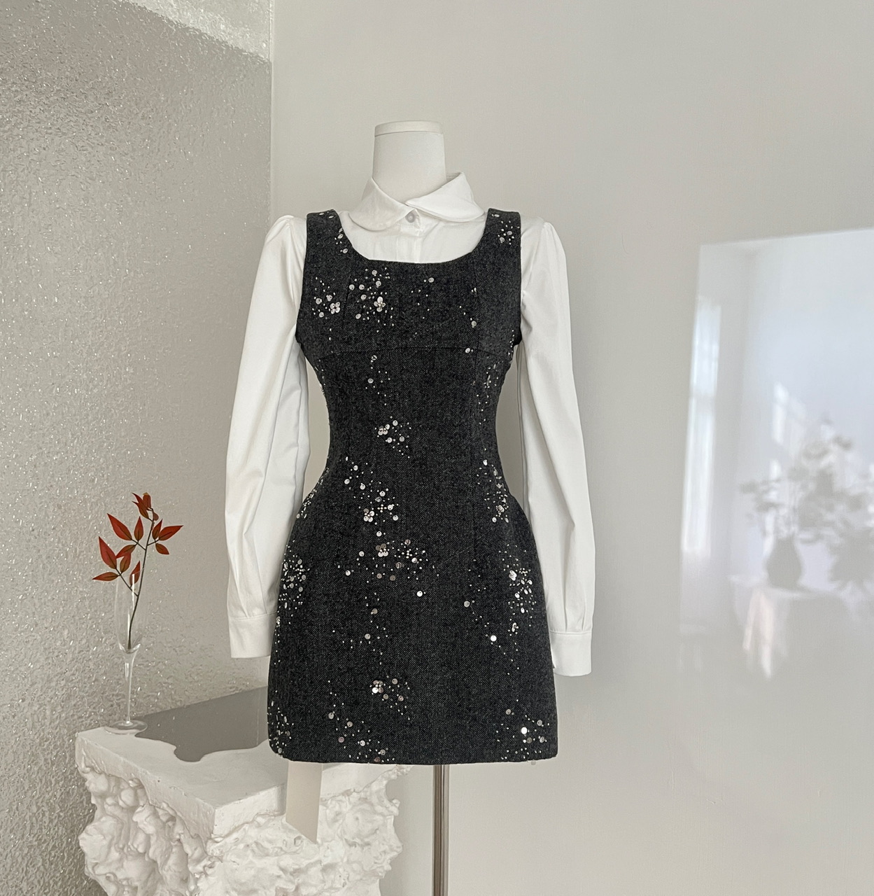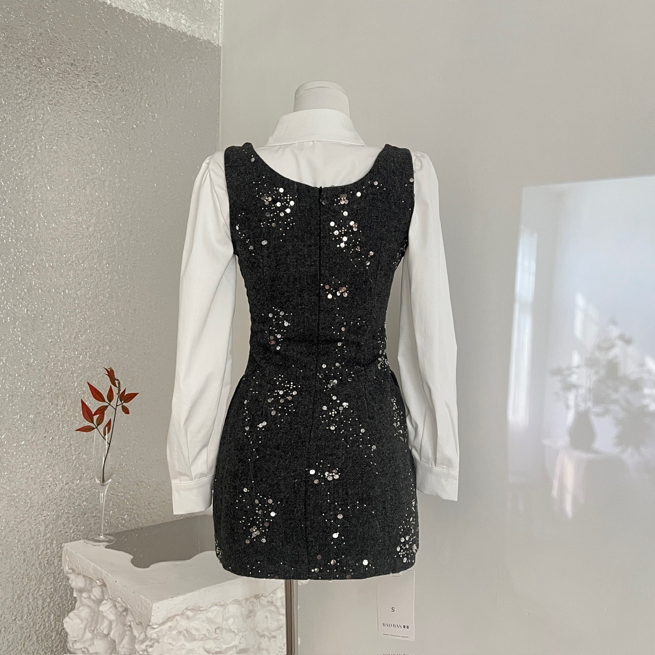 French Doll Collar White Blouse & Black Sequin Vest Dress Two-Piece Set Spring New