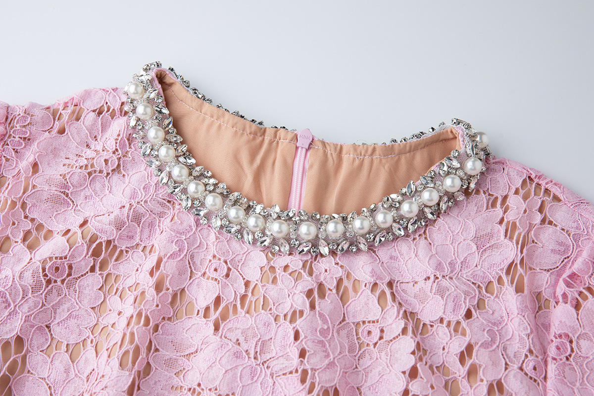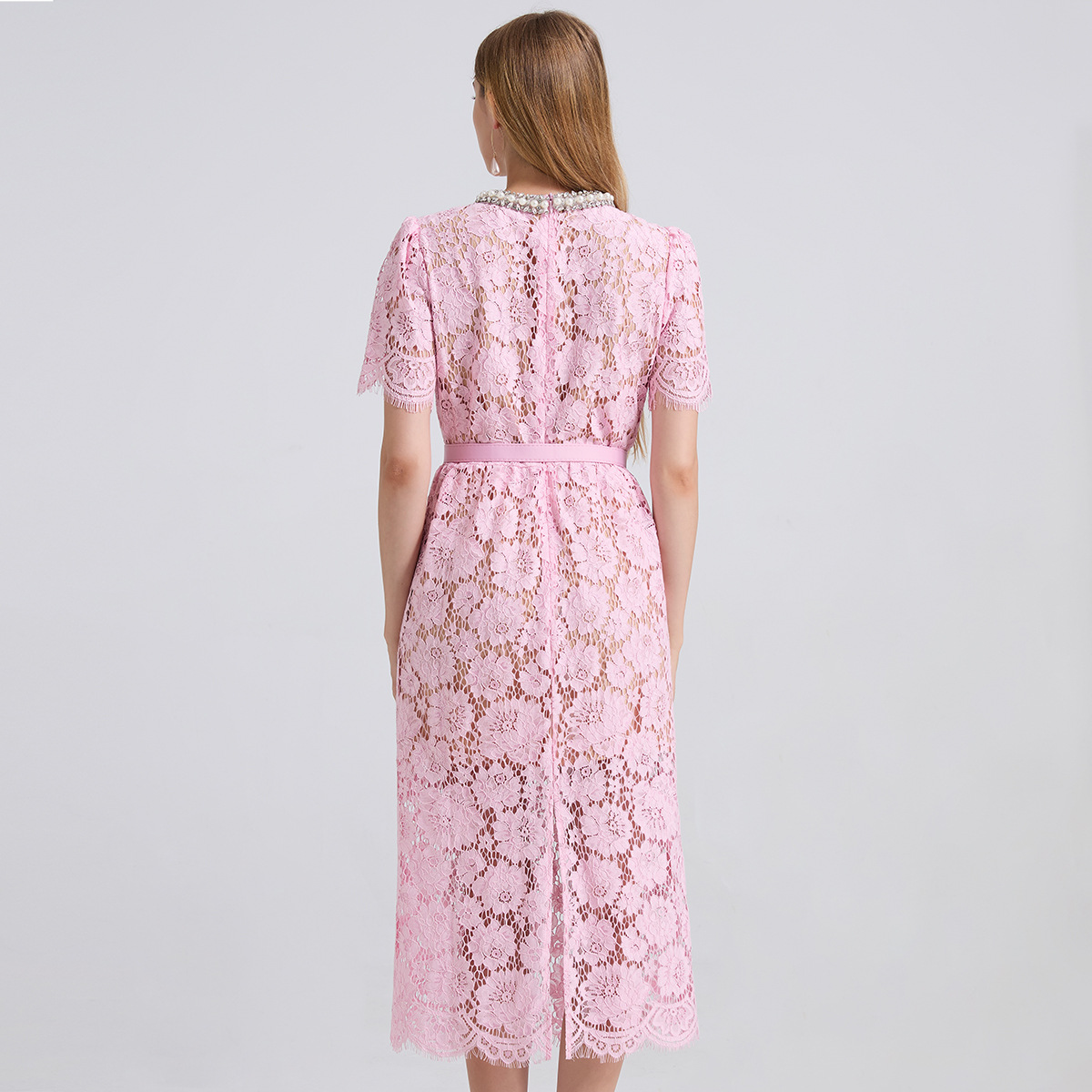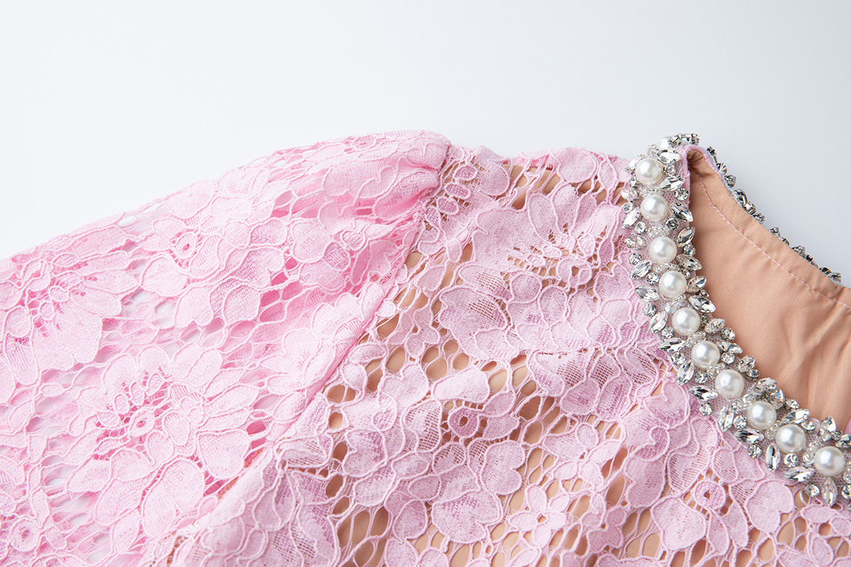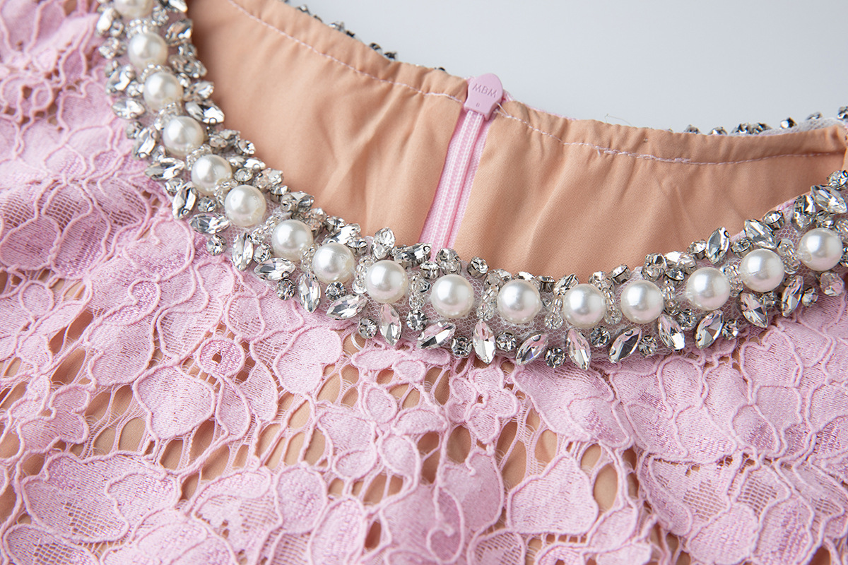 Lace Crew-Neck Beaded High-Waisted Defined-Waistline Dress