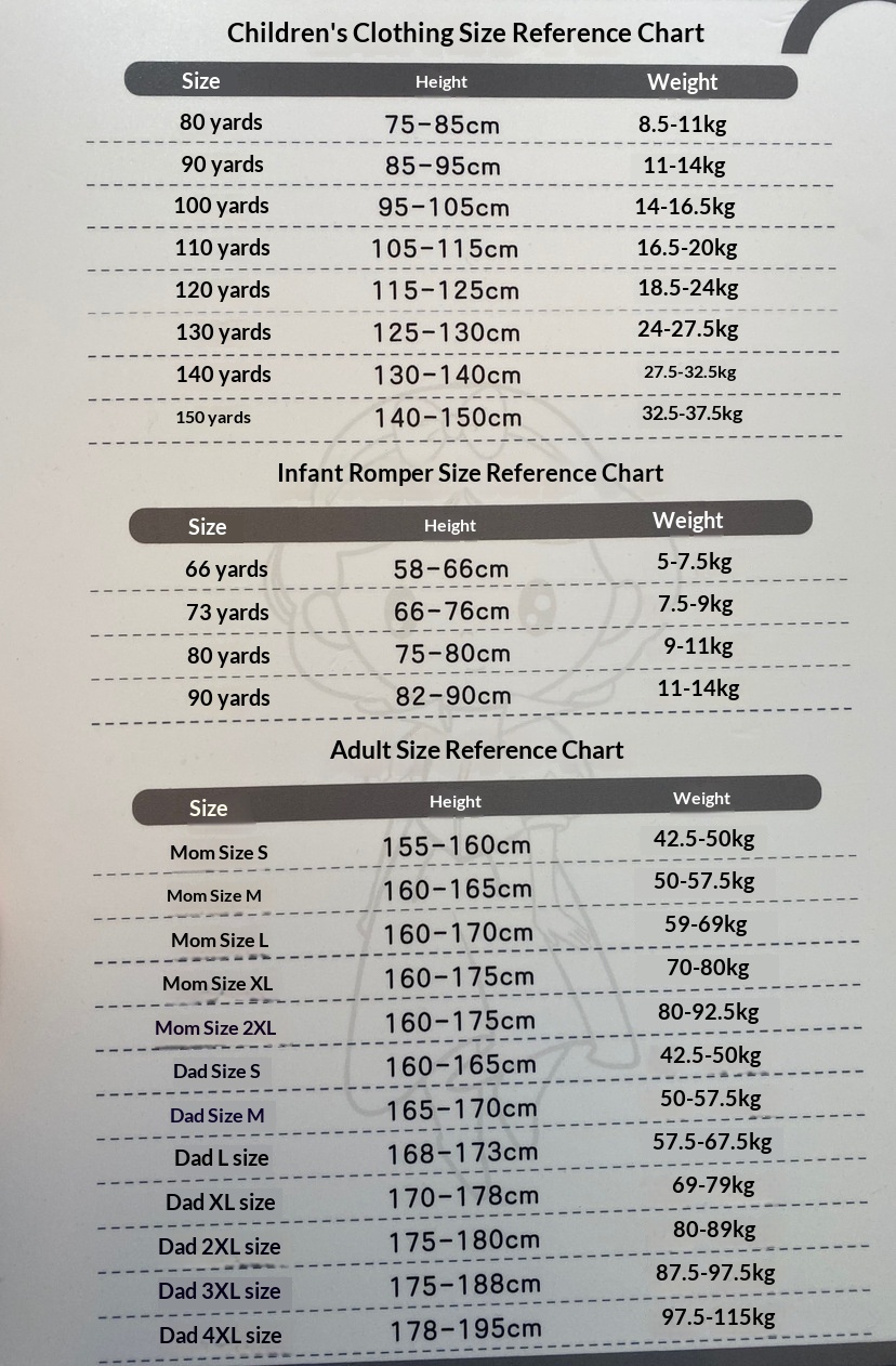 Applicable heights: Girls’ sets in sizes 80, 90, 100, 110, 120, 130, 140, and 150; boys’ sets in sizes 80, 90, 100, 110, 120, 130, 140, and 150; mom’s clothing in sizes S, M, L, and XL; adult clothing in sizes M, L, XL, XXL, 3XL, and 4XL; baby bodysuits in sizes 66, 73, 80, and 90.