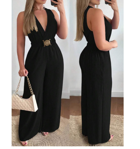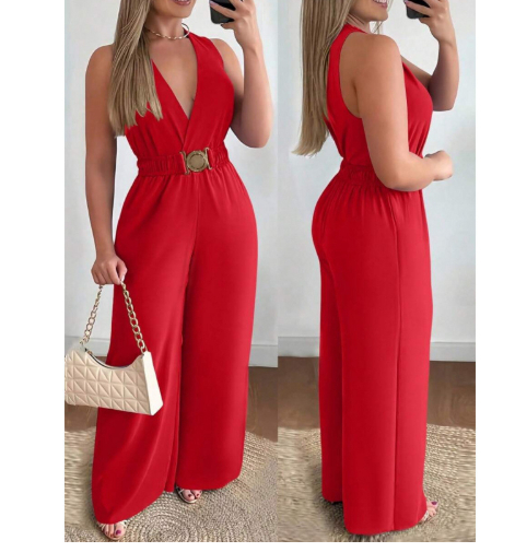 Resort-style Wide-leg Pants With A Crossover V-neck And Metal Buckle Waist