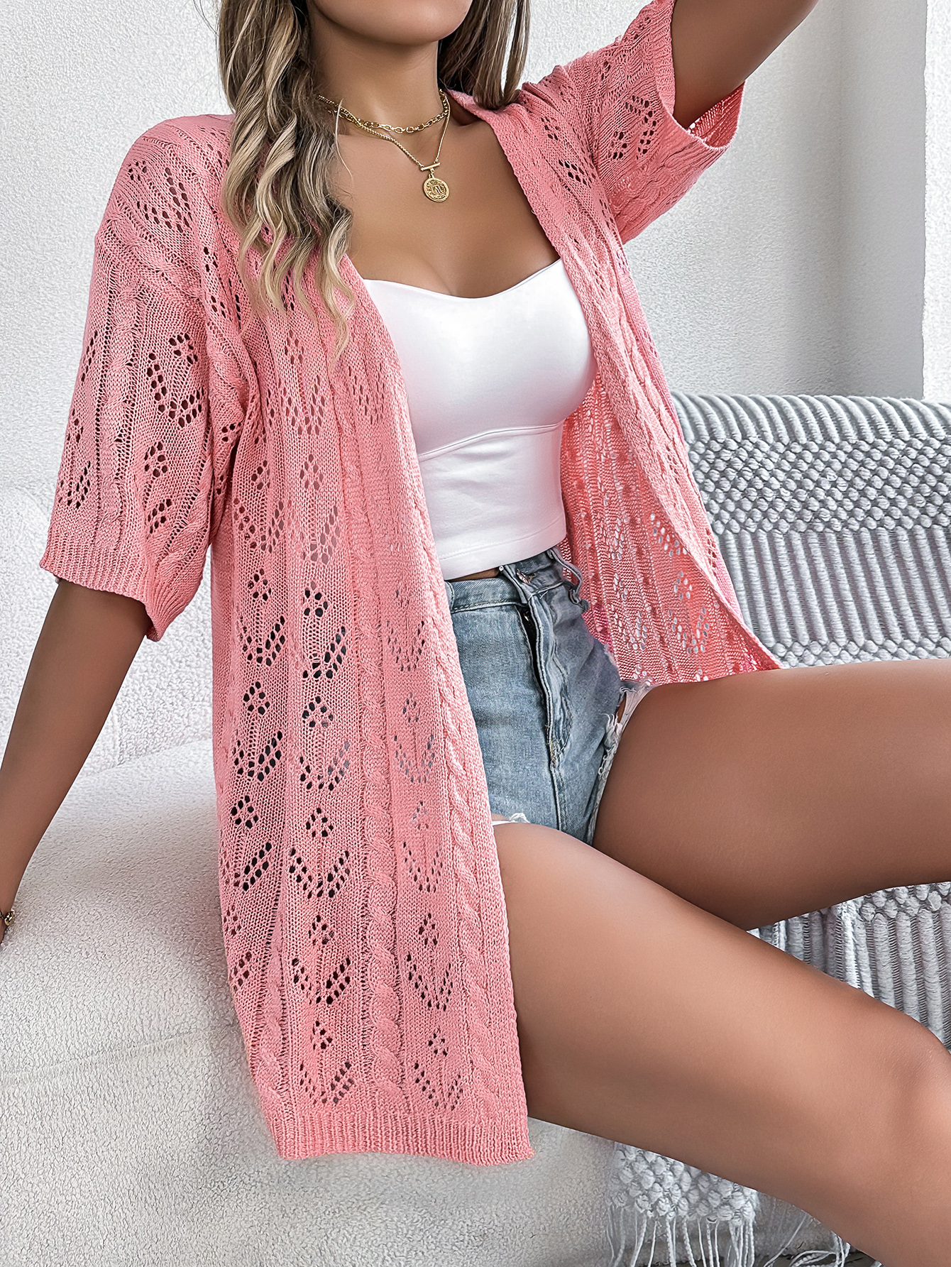 Women S Hollow Out Short Sleeve Knit Cardigan Vacation Cover-Up