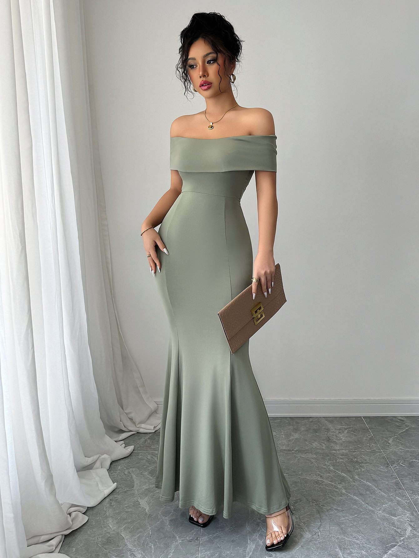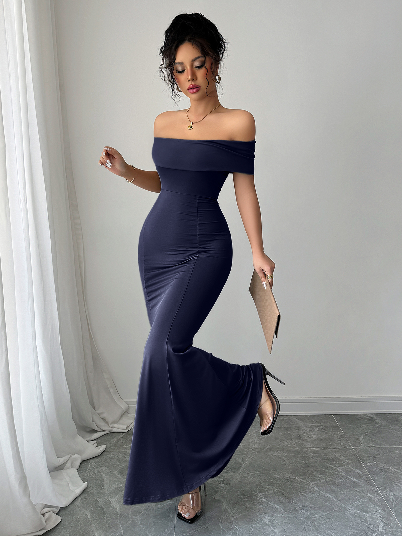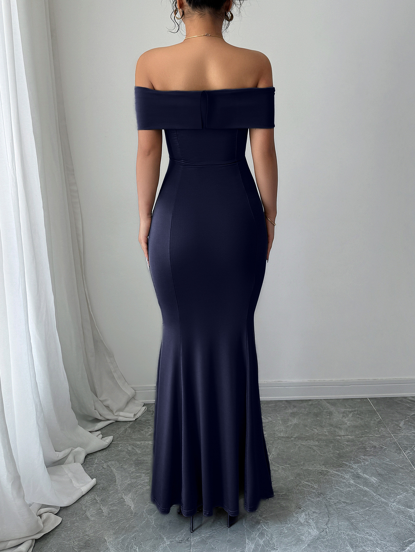 Womens Solid-Color Off-the-Shoulder Slim Long Dress